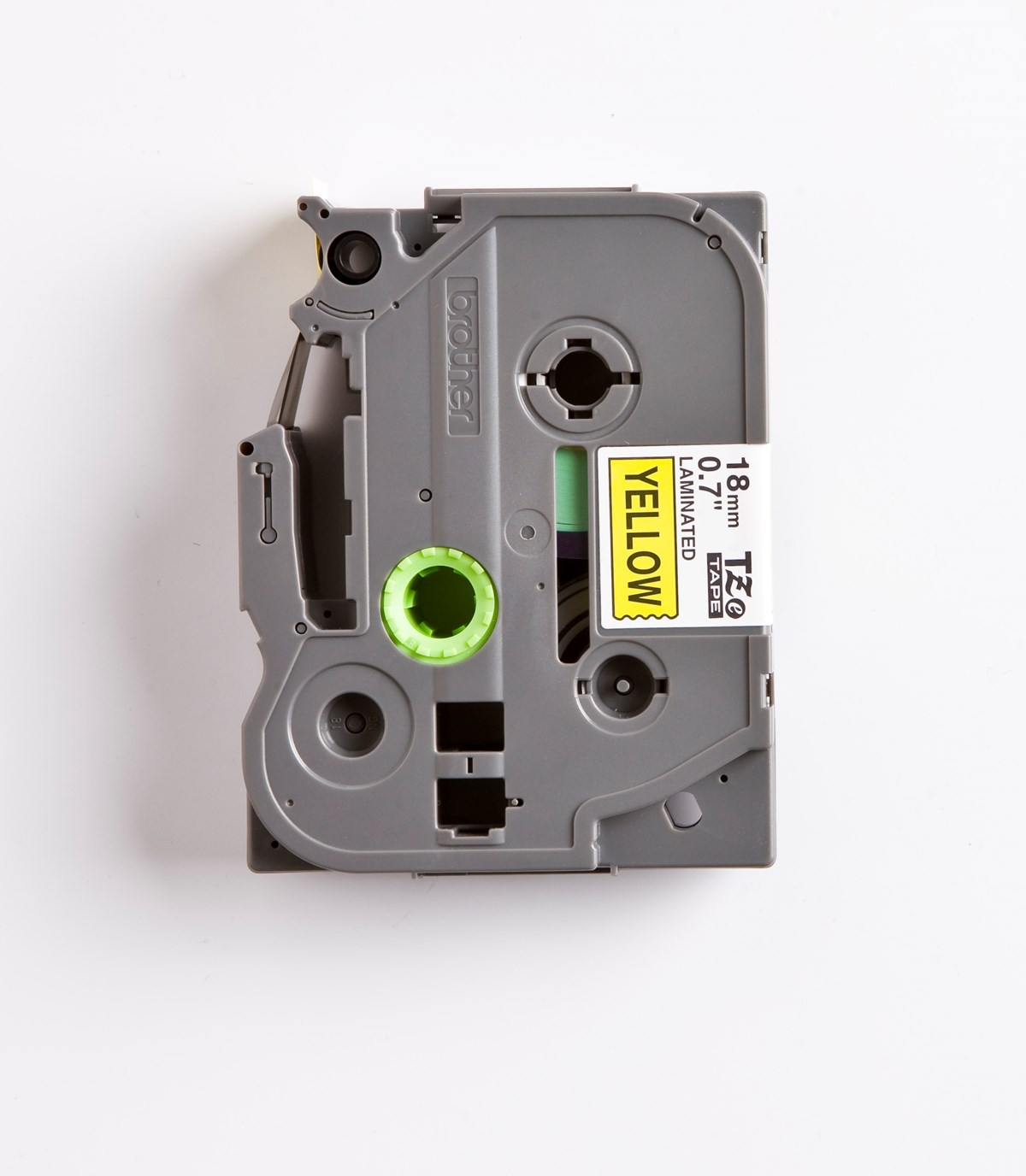 TZe tapekassetter är enkla att installera, finns i olika bredder, färger och material och säkerställer att din P-touch-märkmaskin uppfyller dina märkningsbehov. Mått: 18 mm x 8 m.