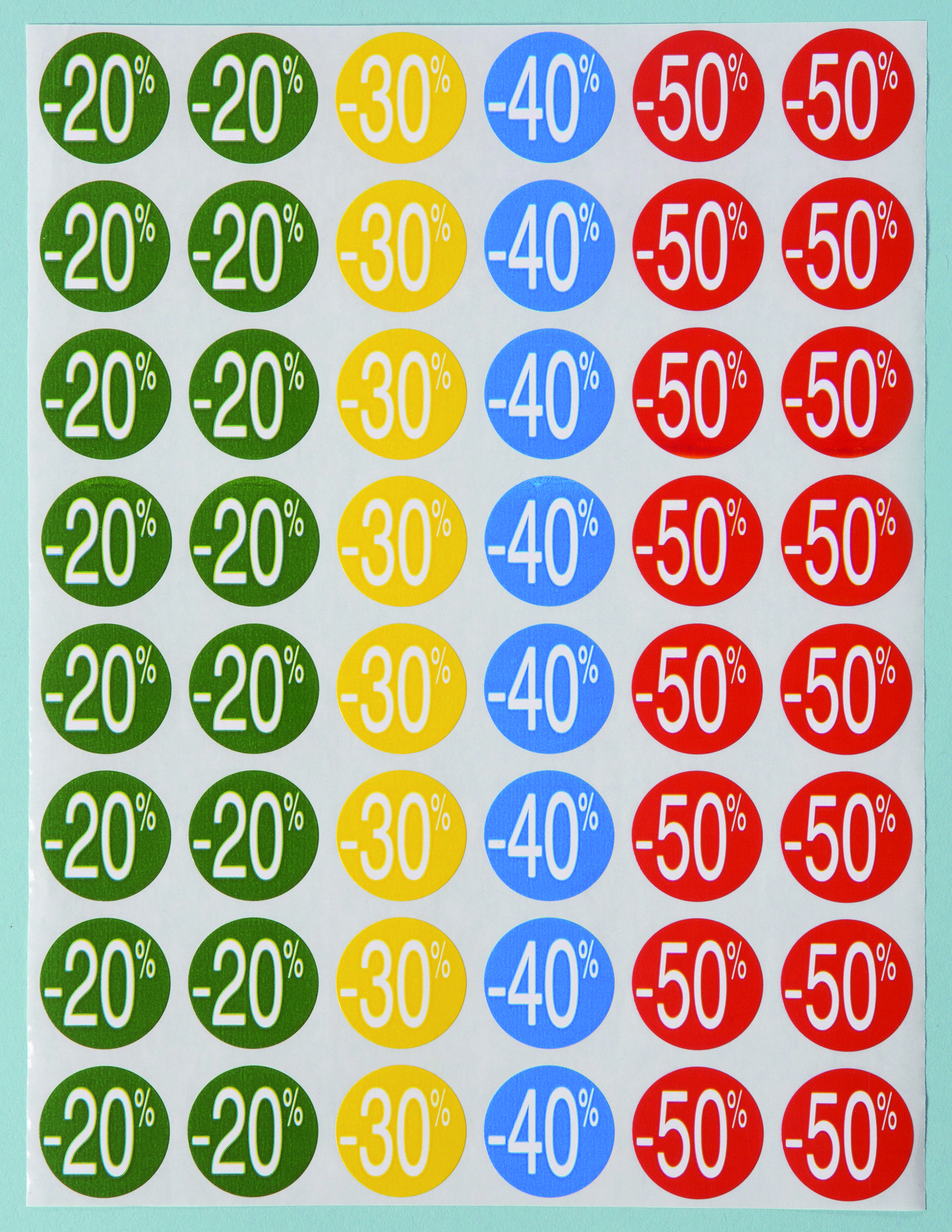 Självhäftande i fyra olika färger med fyra olika rabattsatser. 24 mm i diameter. 240 etiketter.
