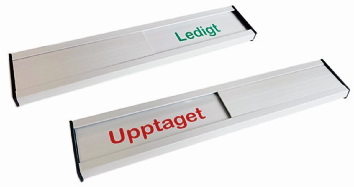 Skjutpanel skylt för Ledigt/Upptaget med färgkodning i grönt och rött. Levereras med dubbelhäftande tejp men kan även fästas med skruv. Strl. 200x40 mm