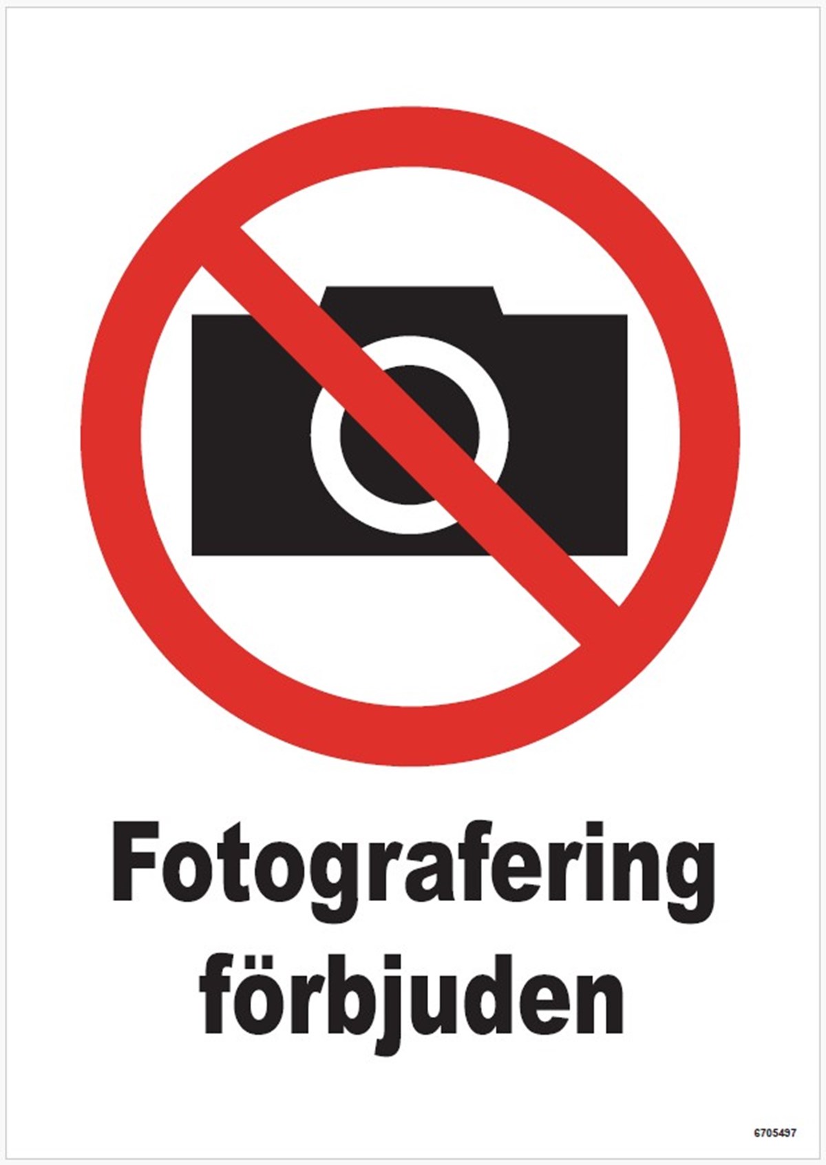 Skylt Fotografering Förbjuden i plast. Strl. A4 210x297 mm