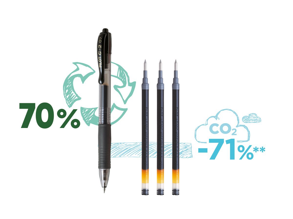 Penna med klickmekanism. Gummerat och räfflat fingergrepp. Gelbläckets mjukhet ger pennan en fantastisk skrivkänsla. 50% av pennans plastdetaljer är tillverkade av återvunnet material. Svart och blå är dokumentäkta enligt ISO 27668-2. 12 st/förp.