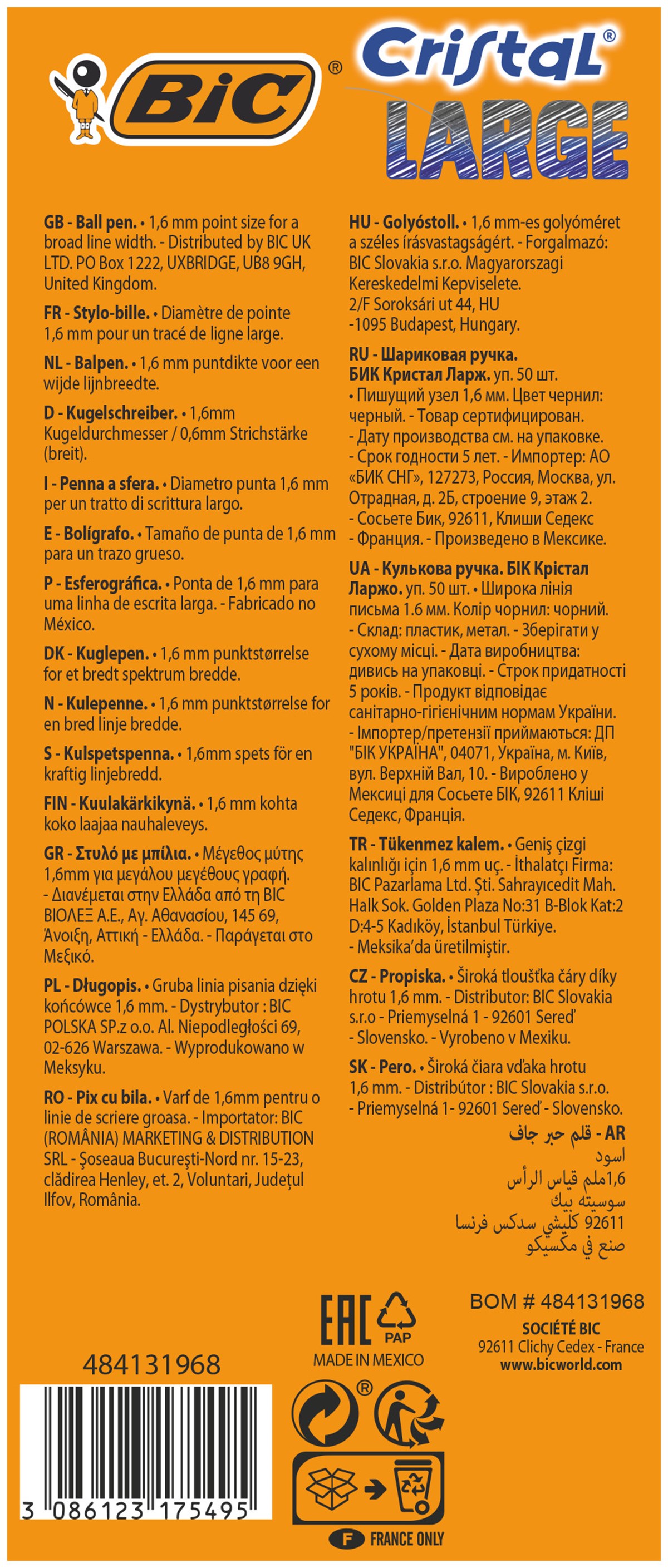 Genom årens lopp har den första BIC-pennans karakteristiska design gjort den till en klassiker. BIC Cristal-pennan och dess stora familj – Fine, Fun, Grip, Original, Soft och Large – täcker allas skrivbehov. BIC Cristal Large-pennan har en 1,6 mm bred spets för linjer som är ännu jämnare och mörkare. Den här slitstarka kulspetspennan är perfekt för långa skrivuppgifter och snabba anteckningar. Den fungerar lika bra för att rita samt lösa korsord och sudoku – både svåra och lätta. En vägledande princip hos BIC har alltid varit att hitta den perfekta balansen mellan funktion och design, så den BIC Cristal Large-pennan har en röktonad, sexkantig pennkropp så att du kan kontrollera bläcknivån. Klassiska BIC Cristal-pennan kommer även med en 1,6 mm bred spets för extra läsbarhet. Den välutformade kulan ger ett jämnt bläckflöde så skrivandet blir ett rent nöje. Korken och ändpluggen matchar färgen på bläcket så du snabbt hittar rätt färg.
