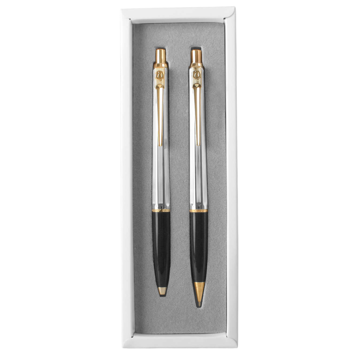 Epoca Medalist har förgyllda detaljer och förkromad ovandel som lämpar sig utmärkt för namngravyr och därmed som present för dina nära och kära eller för dig själv. Det här setet består av en kulspetspenna och en stiftpenna som matchar varandra perfekt.