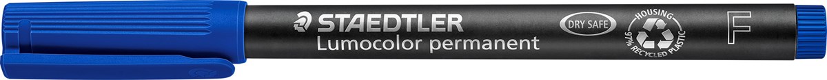 Lumocolor® permanent penna tillverkad av 97 % återvunnen plast, för användning på praktiskt taget alla ytor. Lämplig för overheadfilm. Även lämplig för användning på CD/DVD samt märkning på metall, plast, trä och andra icke-absorberande ytor. Utmärkt kvalitet, smutsavvisande och vattentät. Torkar på några sekunder, därför idealisk för vänsterhänta användare. Permanent, luktfritt bläck. Ljusäkta och väderbeständig i svart färg. PP skaft och hätta säkerställer lång livslängd. kan ligga utan hätta i dagar utan att torka ut. Flygsäker - automatisk tryckutjämning förhindrar att pennan läcker på planet. Pennfodralet är tillverkat av 97 % återvunnen plast, enligt ISO 14021 (dkaft, hätta och ända) Superb färgglans. Påfyllningsbar. Linjebredd Fin ca. 0,6 mm.
