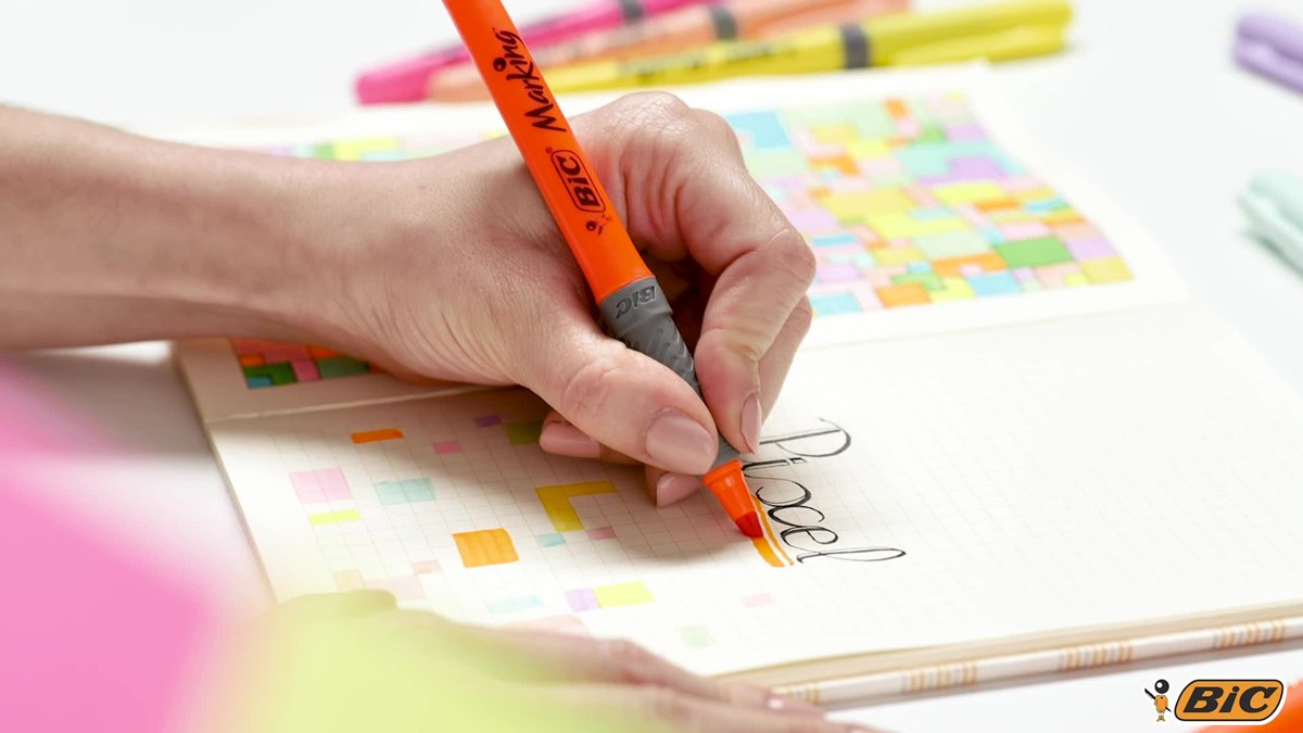 Överstrykningspenna med fluorescerande vattenbaserat bläck i fem färger: gult, blått, grönt, orange och rosa. Torkar inte ut på upp till 8 timmar. Snedskuren spets som ger 1,6 mm breda linjer för understrykning och 3,3 mm för bred överstrykning.