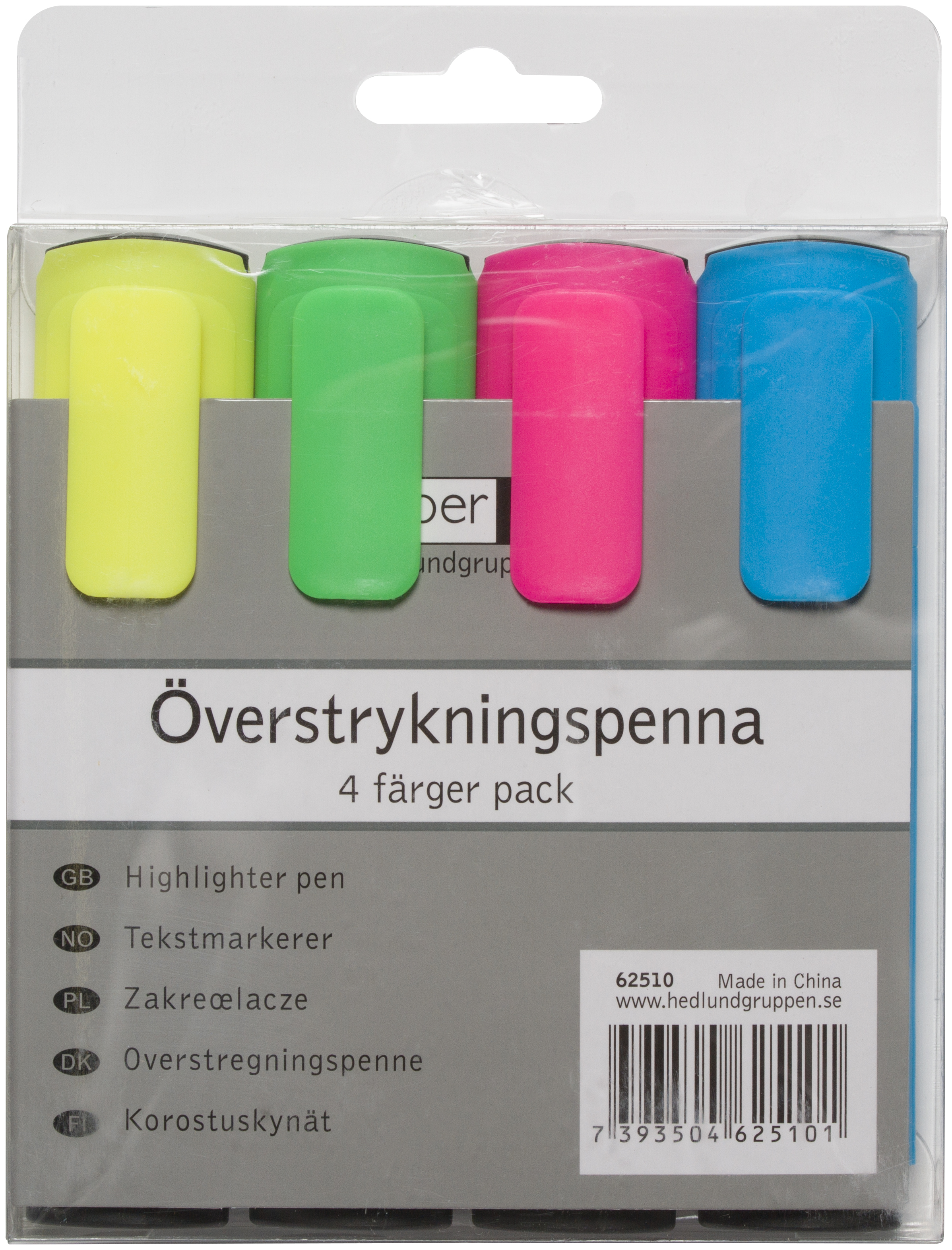 Penna med fluorescerande, vattenbaserat bläck som är snabbtorkande och luktfritt. Snedskuren spets. Enfärgade: 10 st/förp., set: 12 set/förp.