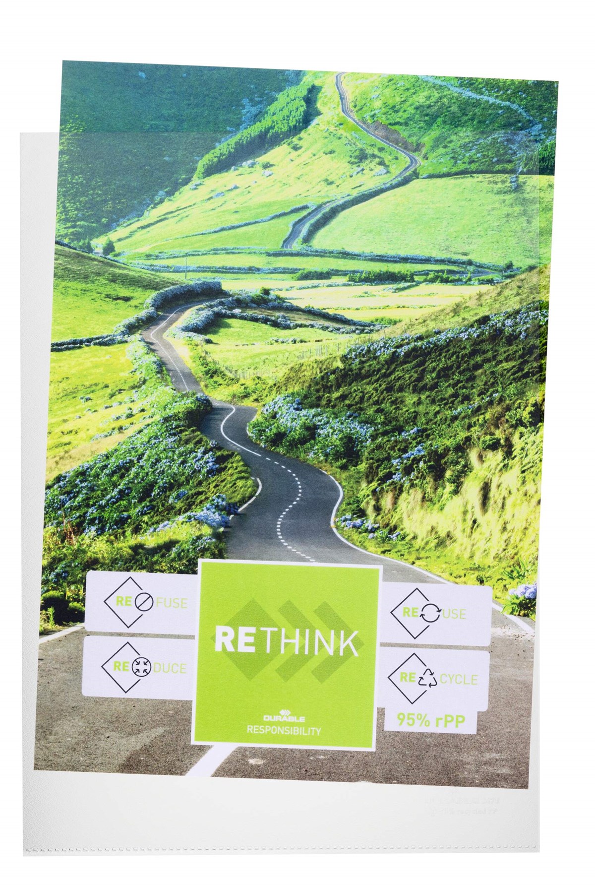 Tillverkad av (100µ) polypropylen bestående av minst 95% återanvänt material från tillverkningsspill från produktion och industri. Detta rPP material som minskar behovet av ny plast är en del av Durables RETHINK strategi.