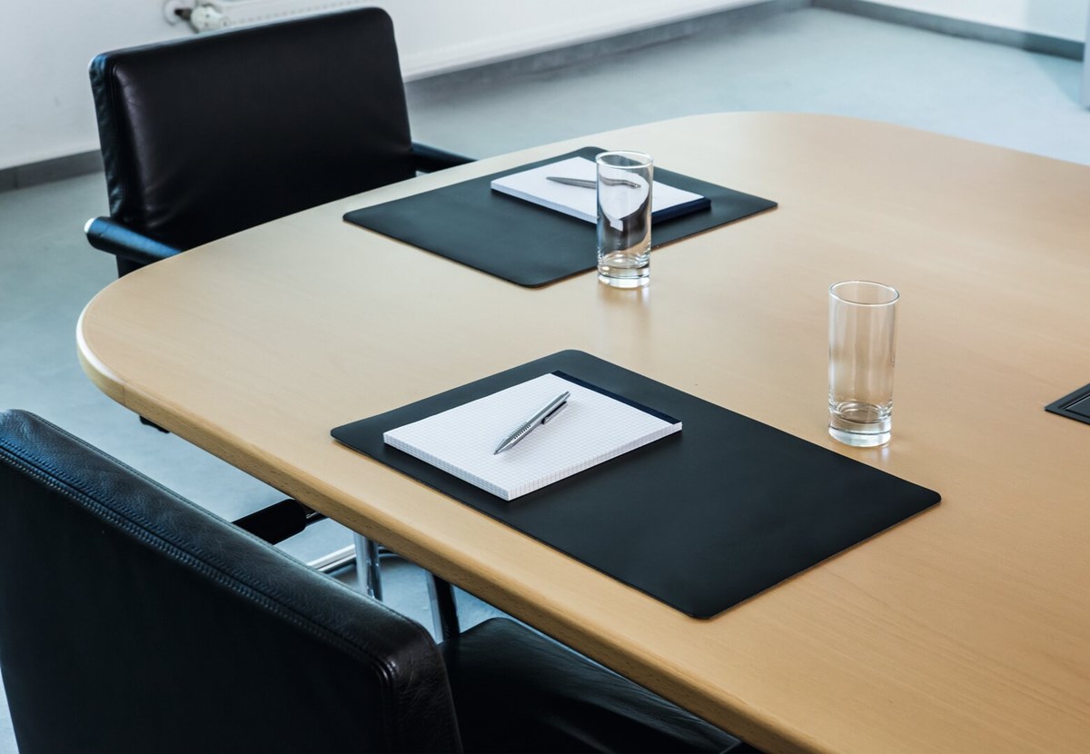 Svart konferensunderlägg, i mindre format, passande för konferens- och mötesrum. Ger en mjuk och skön skrivkänsla. Tunn dekorativ "söm" rand längs kanten.Tack vare en tillverkningsmetod, som gör att undersidans yta får bra grepp, ligger underlägget stadigt på bordet utan att glida. Kan torkas av med en fuktig trasa på båda sidorna. Tillverkad av polyproylen och 100% återvinningsbar.