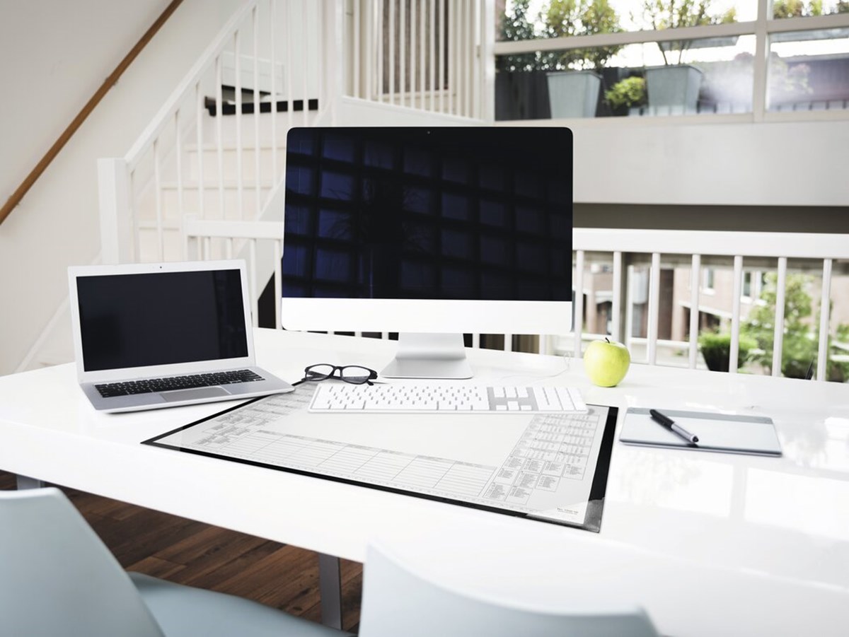 Skydda bordet från slitage med ett skrivbordsunderlägg som kombinerar funktionalitet och hållbarhet. Underlägget har ett limbundet block med 25 blad, 2‑årsöversiktskalender, veckoschema och helgdagar i nio länder. Längst ner finns även en linjalskala.