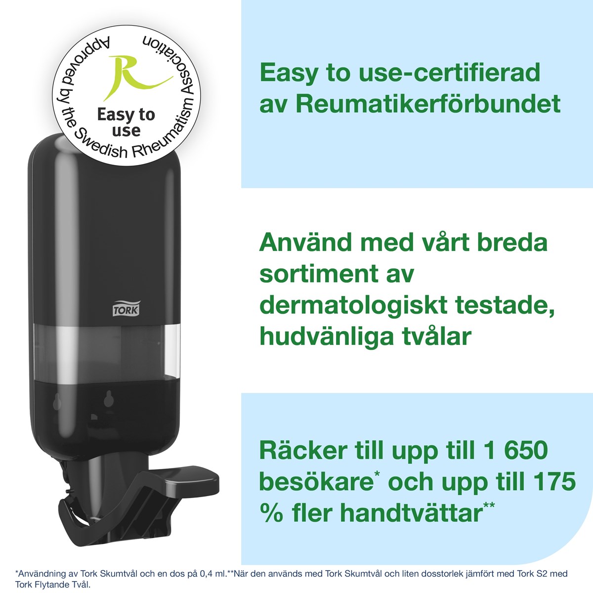 - Räcker till upp till 1 650 besökare (baserat på Tork Skumtvål med dosering på 0,4 ml och med 1,5 tryckningar per besökare)