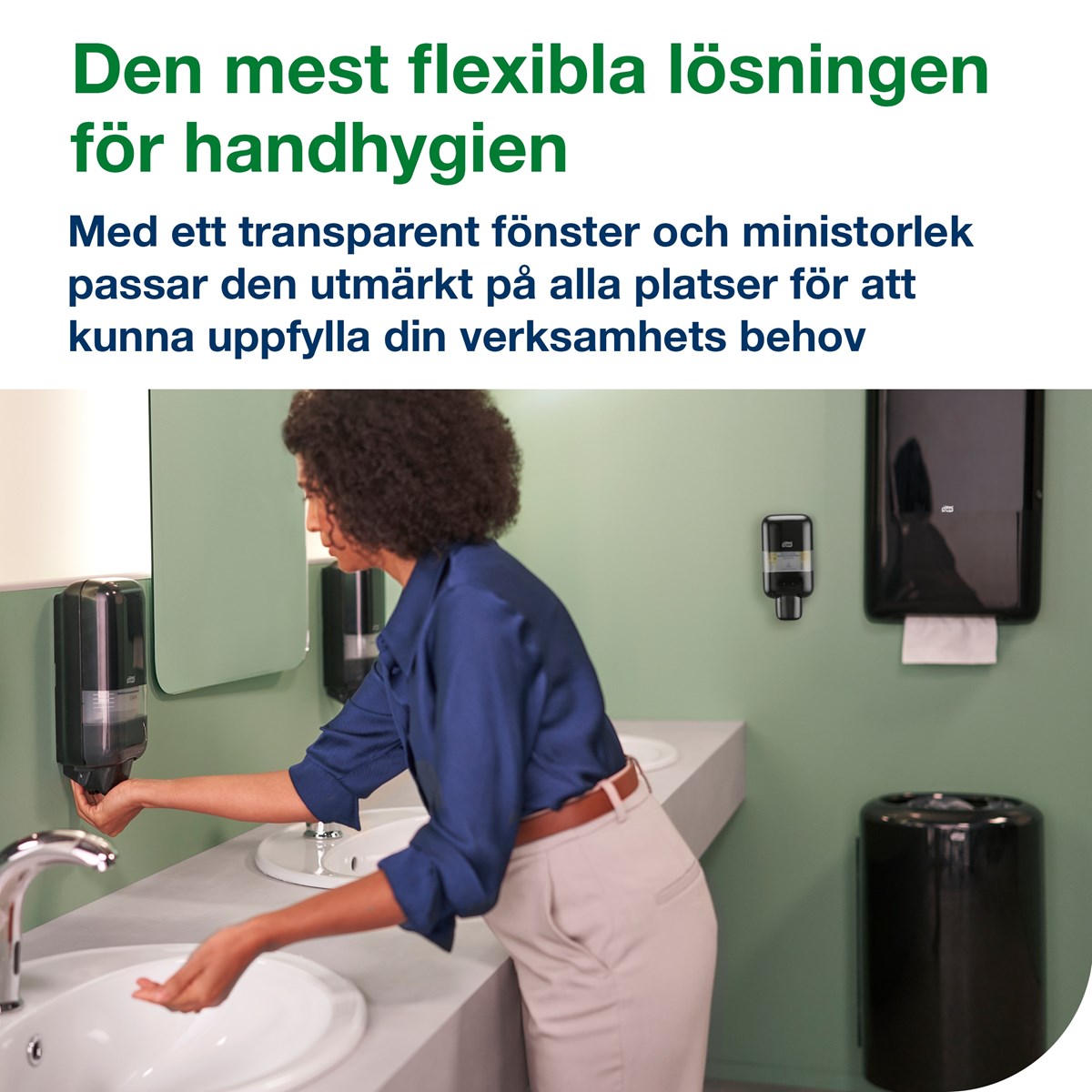 Tork Dispenser Tvål och Handsprit Mini Svart S5 passar överallt. Denna dispenser kan användas med ett brett sortiment av Tork refiller med tvål, handsprit, duschcreme, sitsrengöring och lotion i hygieniskt förseglade flaskor för att tillgodose behoven hos din verksamhet. Tillförlitlig utmatning, varierande dosstorlek och en design som är Easy to use-certifierad främjar god handhygien för alla användare. Gör ett bestående intryck på dina gäster med den funktionella och moderna designen hos vår mest mångsidiga dispenser för tvål och handsprit.Fördelar:
