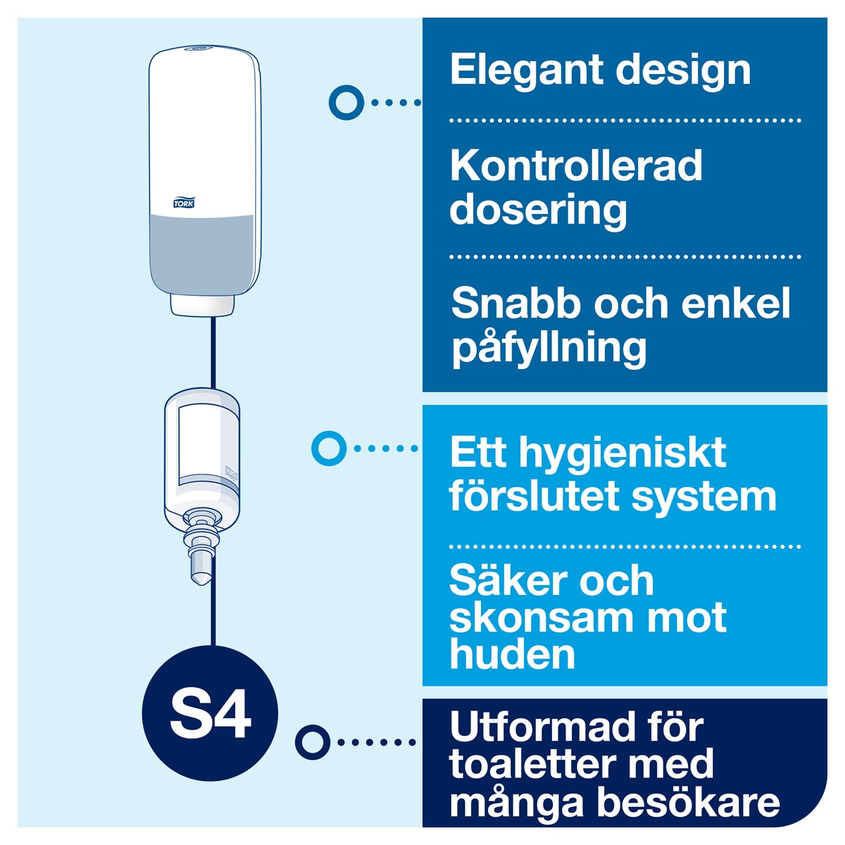 Beröringsfri, sensorstyrd hållare i rostfritt stål för Tork skumtvål. Hög kapacitet, en skumtvålsflaska ger 2500 doseringar. Hölje i lätt borstat rostfritt stål med skydd mot fingeravtryck ser snygg ut och förblir ren. Fönster på båda sidor för att man lätt ska kunna se när refillflaskan behöver bytas ut. Dokumenterat enkel att använda både för användare och städpersonal av Svenska Reumatikerförbundet. Mått: H27,8xB11,6xD13 cm. Drivs med 4 st LR14/typ C-batterier.