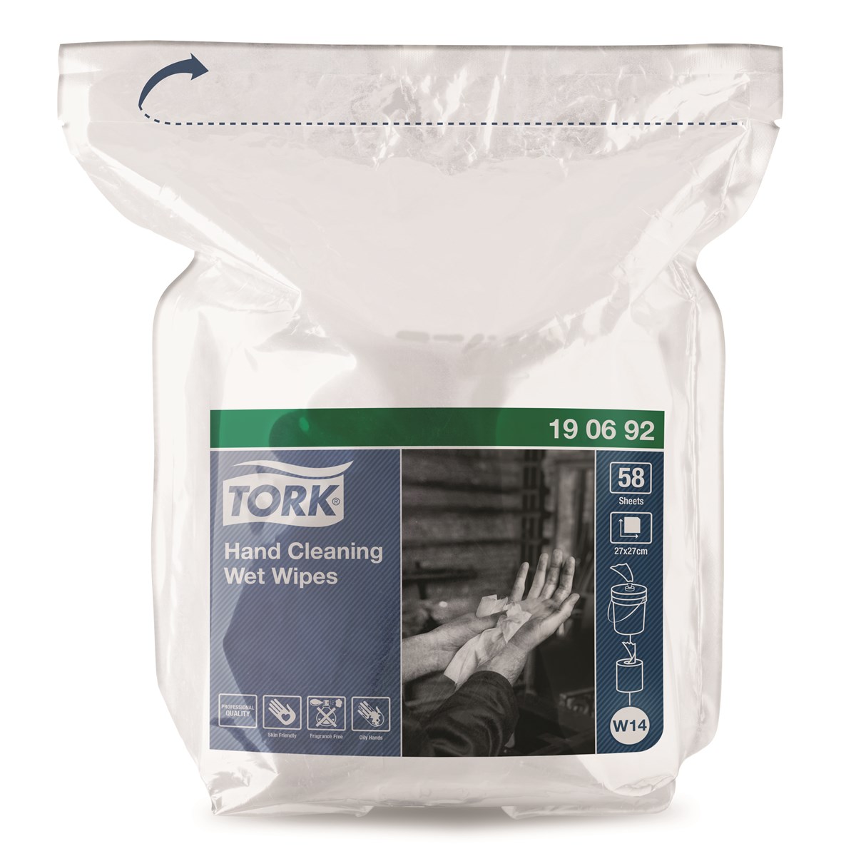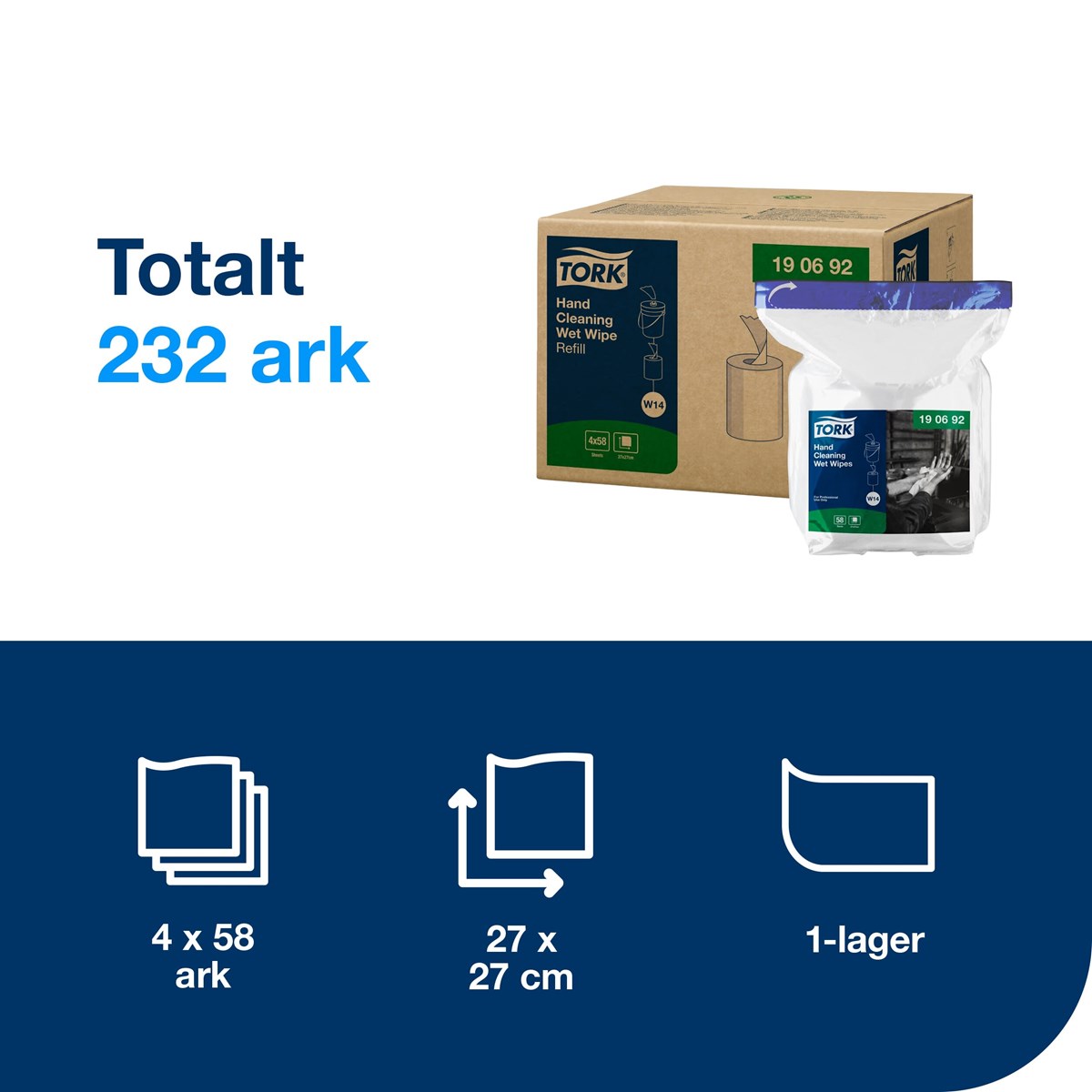 För påfyllning av artikelnummer 190592. Våtduk för snabb och effektiv handrengöring i miljöer där vatten inte finns att tillgå. Torkar effektivt bort färg, olja, smuts eller fett från händerna. Parfymfri och skonsam mot huden. 4 förpackningar x 58 våtdukar. Mått: 27 x 27 cm.
