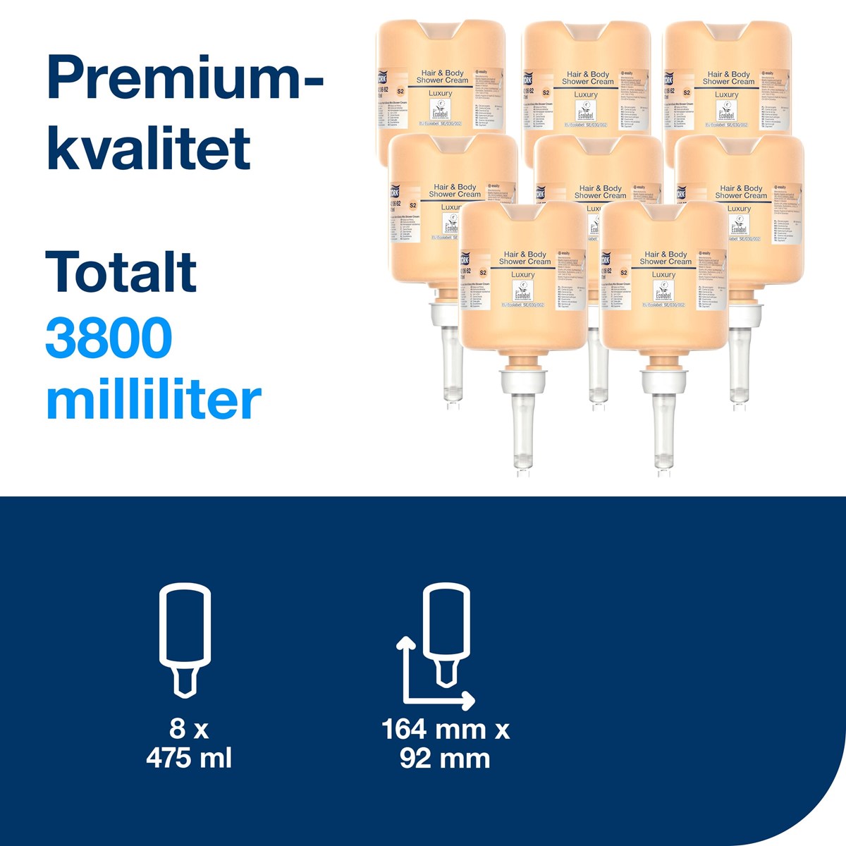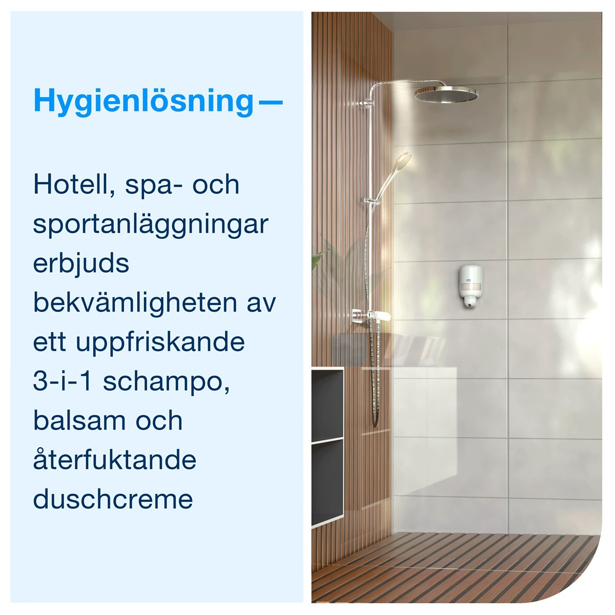 Tork Luxury Hair & Body Duschcreme är en lyxig 3-i-1-duschupplevelse som passar perfekt för hotell, spa och idrottsanläggningar. Duschcremen är berikad med arganolja och balsam och fungerar både som ett uppfriskande schampo och en fuktgivande duschcreme. Utöver att skonsamt rengöra hår och kropp fungerar den som ett vårdande balsam som gör håret mjukt och följsamt. Passar med Tork Tvål och Handdesinfektion Dispensrar som är Easy to use-certifierade och ger god handhygien till alla användare.