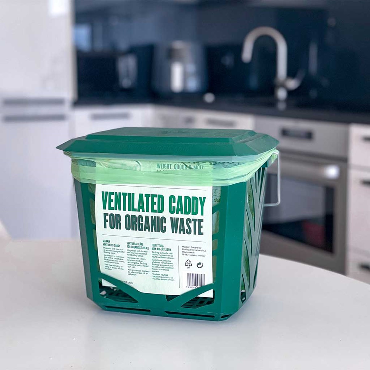 Hållaren passar Biobags komposterbara avfallspåsar i storlekarna 8, 10 och 20 liter och skapar ett komplett system för att sortera organiskt avfall innan det skickas till kompostering eller biogasbehandling.