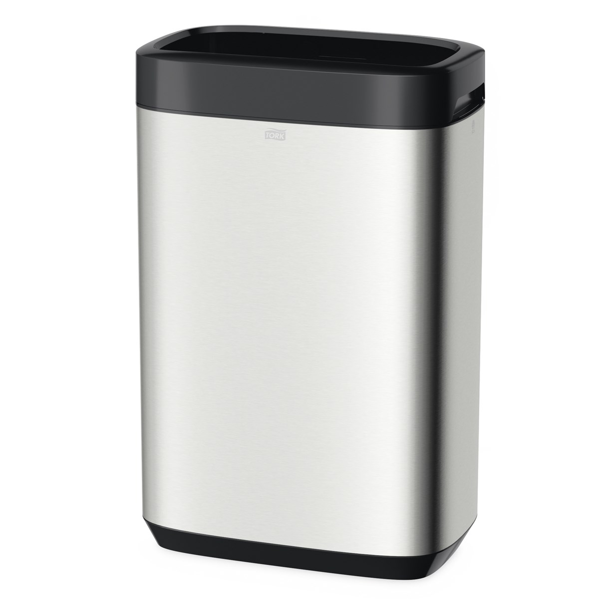 Stilren papperskorg i rostfritt stål. Kan monteras på väggen eller placeras på golvet. Den dolda soppåsen ger ett fräscht intryck för användaren. Rymmer 50 liter. Självstängande lock finns som tillbehör. Mått: (HxBxD) 61,4x39,5x25,3 cm.