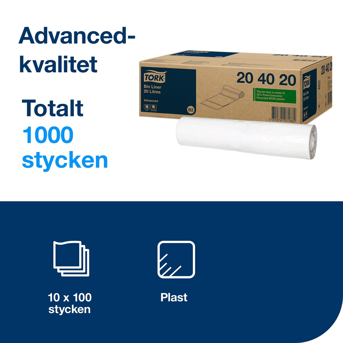 För att upprätthålla en hög standard behövs en del nödvändigheter i ditt utrymme – det är där våra vita Tork Soppåsar 20 l kommer in i bilden. Deras höga kvalitet och tjocka plast ger en utmärkt prestanda, förhindrar att påsarna går sönder och gör dem till ett säkert val för sophantering. Dessutom är de buntade i användarvänliga rullar, så att personalen kan lägga mindre tid på att tömma och fylla papperskorgar och mer tid på andra viktiga uppgifter.10 förpackningar, med 100 påsar vardera. Passar med B2 dispensrar.