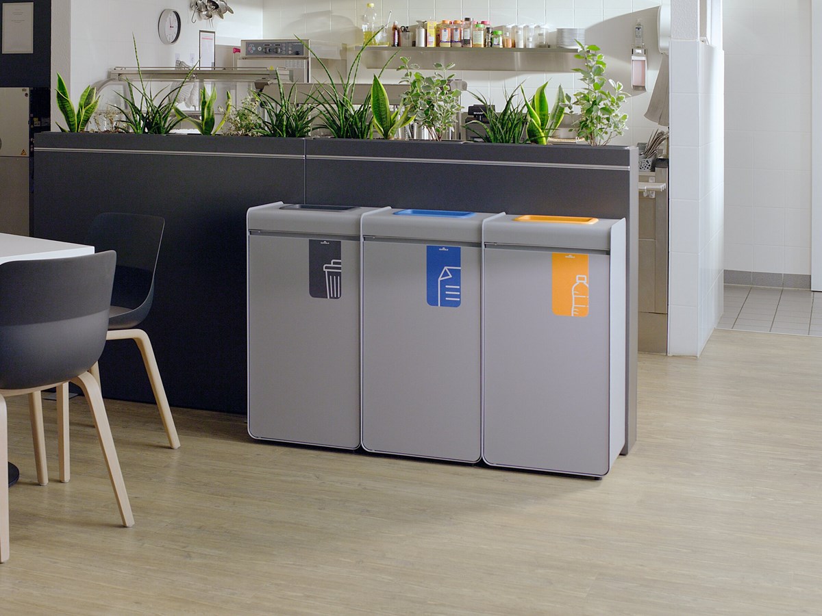 Tillverkad av pulverlackad metall, med en lättöppnad dörr med "tryck-och-öppna mekanism". Innerbehållaren av lätt plast rymmer 55 liter och har grepp så att den är lätt att ta ut och tömma. Möjlighet att fixera påsen om en sådan används. Justerbara fötter säkerställer att kärlet står stabilt på ojämna ytor.