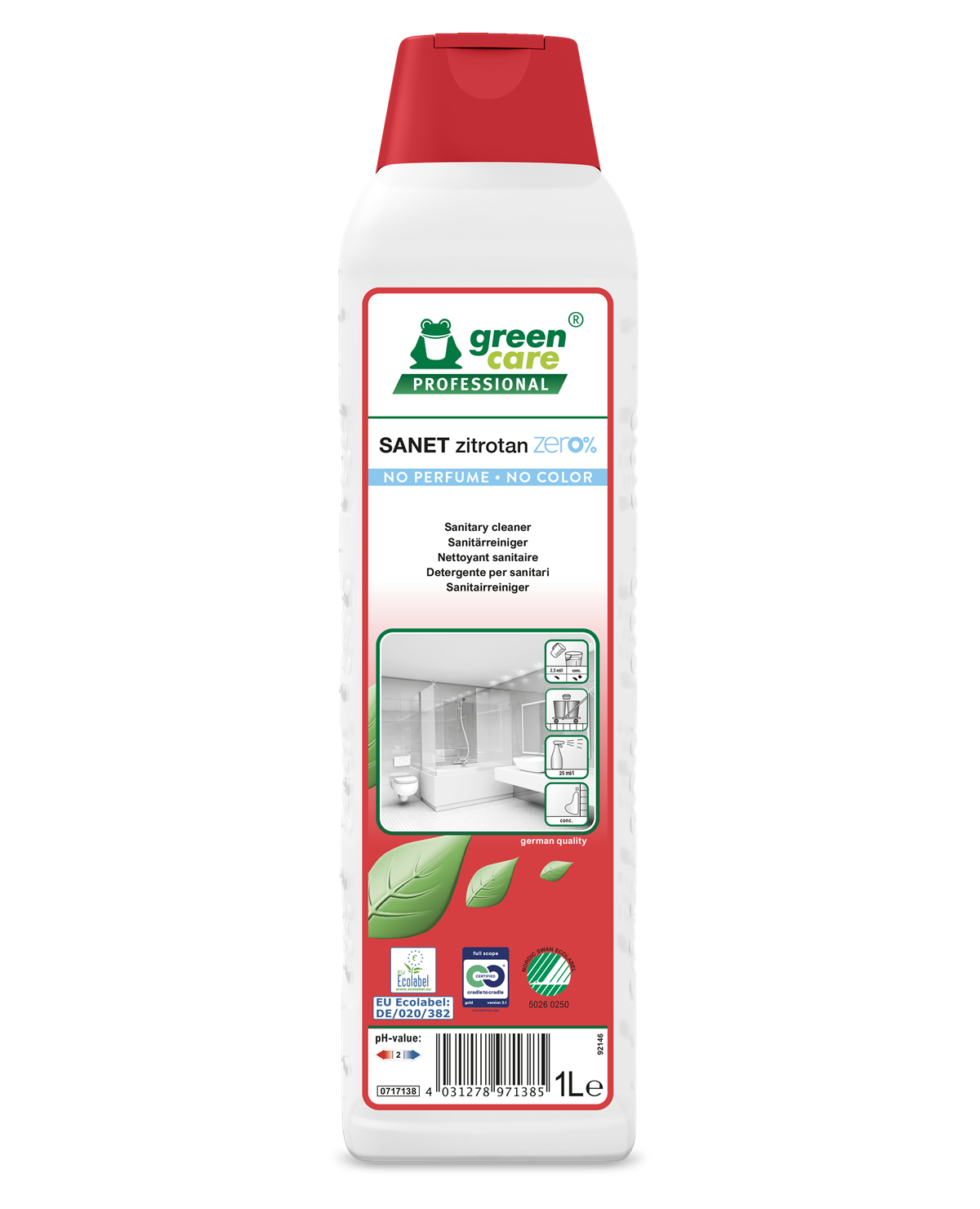 SANET zitrotan zero% är ett syrabaserat sanitärrengöringsmedel som inte innehåller parfym eller färgämnen. Tar hänsyn till biologiska cykler, värnar om människors hälsa och städpersonalens säkerhet