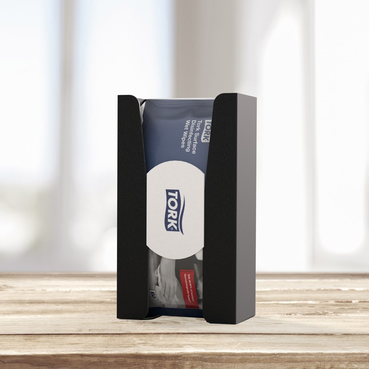 Dispenser Tork Våtdukar för ytdesinfektion. Kan väggmonteras eller användas som en fristående dispenser för flexibel placering. Det återförslutbara locket glider lätt på plats och håller våtdukarna säkert på plats. Tillverkad av aluminium, med borrhål och medföljande skumtejp för valfri montering.