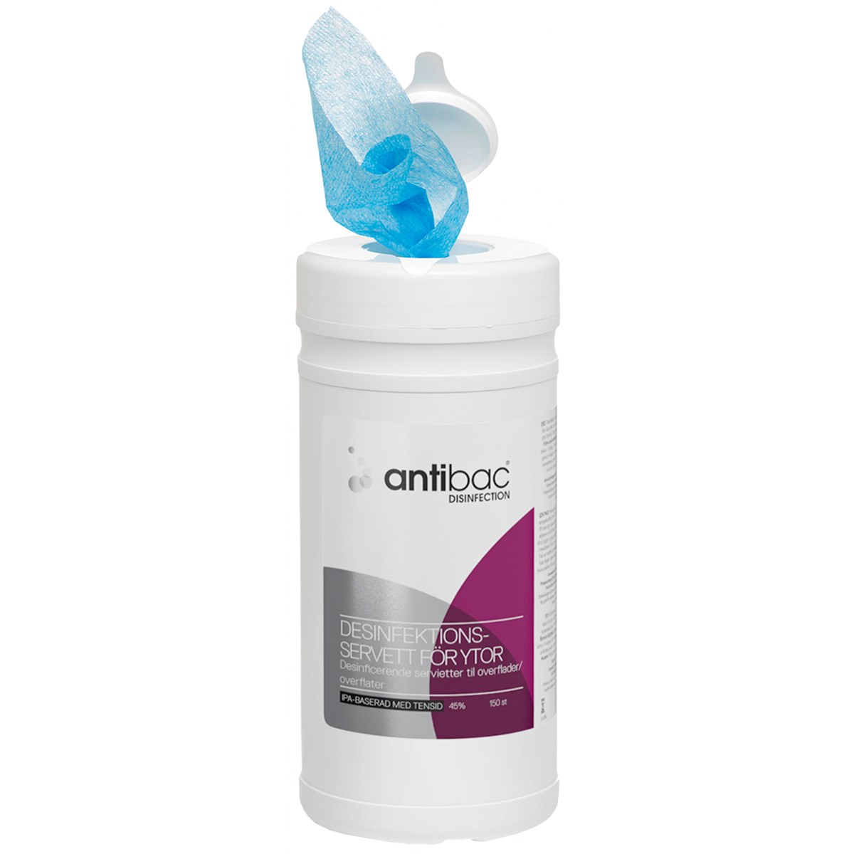Antibac Desinfektionsservett för ytor är en mjuk servett som effektivt minskar risken för smittspridning. Produkten är avsedd för desinfektion av ”tagytor” som t.ex. handtag, bord, kranar etc. men lämpar sig även för desinfektion av t.ex. toalettsitsar. Produkten är effektiv mot bakterier, svampar och olika typer av virus som t.ex. Corona, Hepatit B, C och HIV. Innehåller tensid som gör att ytan inte behöver rengöras innan desinfektion.