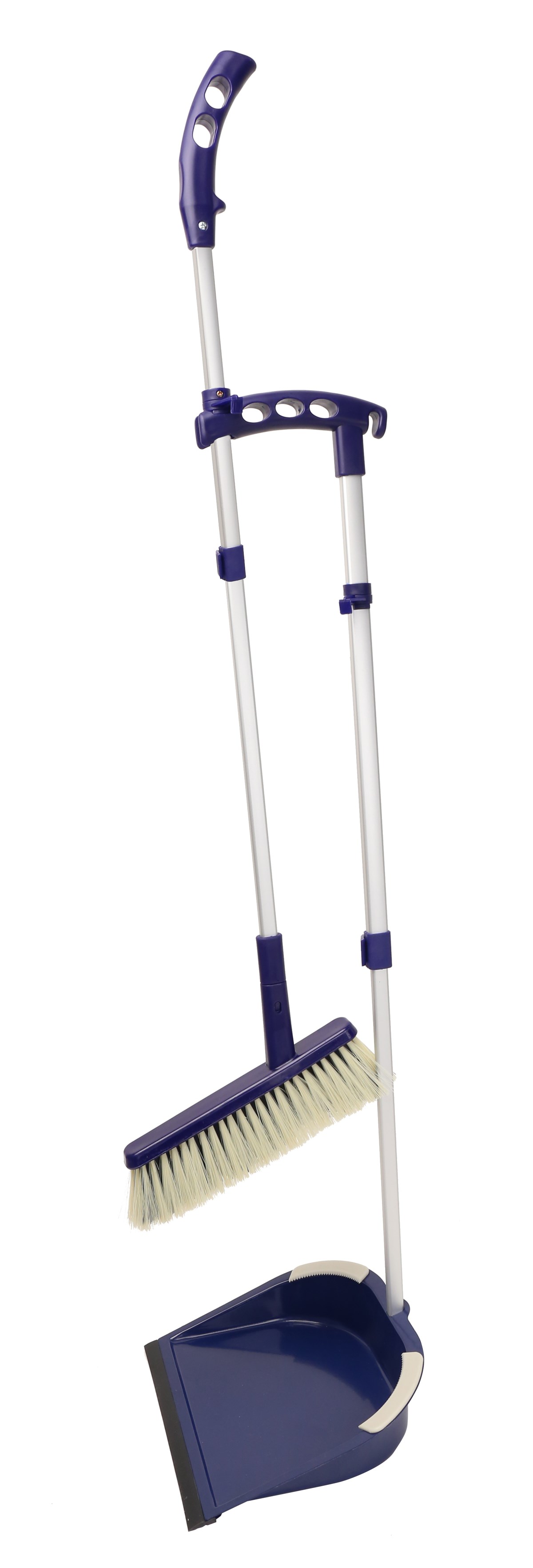 Ställbar sopborste där höjden kan justeras mellan 58 och 91 cm. Borstens handtag är ergonomiskt utformad med både tum- och pekfingergrepp. En smart låsning håller kvar borsten när du hänger upp den på skyffelns handtag. Vridbar upphängningskrok.