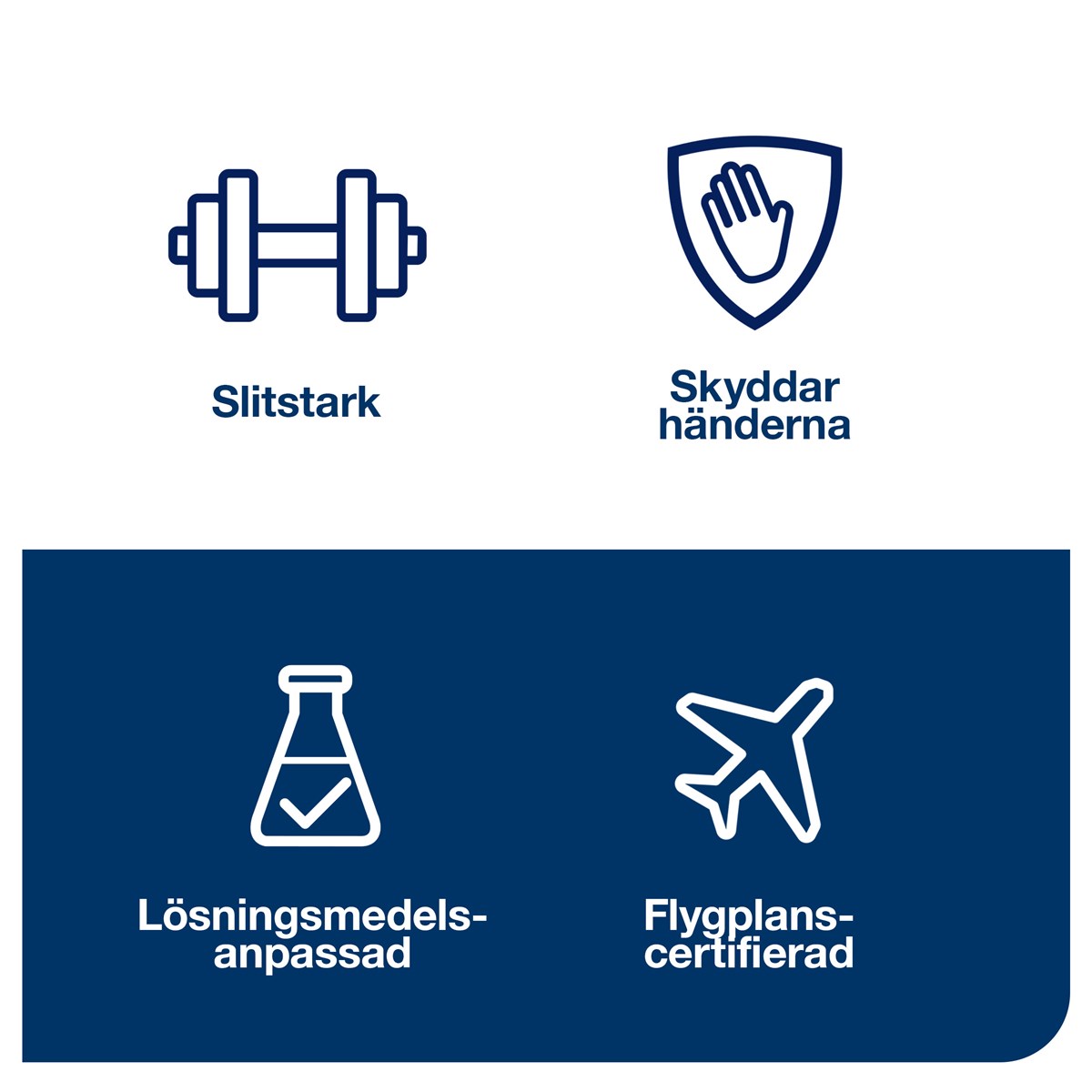 Hantera tuffa industriella rengöringsuppgifter med lätthet tack vare dessa allrounddukar. Det kraftiga materialet skyddar händerna från värme och metallspån. De är dessutom idealiska för att effektivt avlägsna olja och fett. Främja hållbarhet på din arbetsplats med deras innovativa design. Utmatning av en duk i taget innebär att du bara tar vad du behöver, vilket minskar avfallet, och förpackningen är gjord av återvunna material. Vi har även minskat CO2-utsläppen för Tork exelCLEAN® med 28 % sedan 2011* *(Life Cycle Analysis) LCA genomförd av Essity och IVL Svenska Miljöinstitutet i april 20214 förpackningar, med 60 dukar vardera. 1-lagers. Premium-kvalitet. Vikt storlek: D 10.8 cm B 35.5 cm. Ovikt storlek: D 41.5 cm B 35.5 cm. Passar med W4 dispensrar.