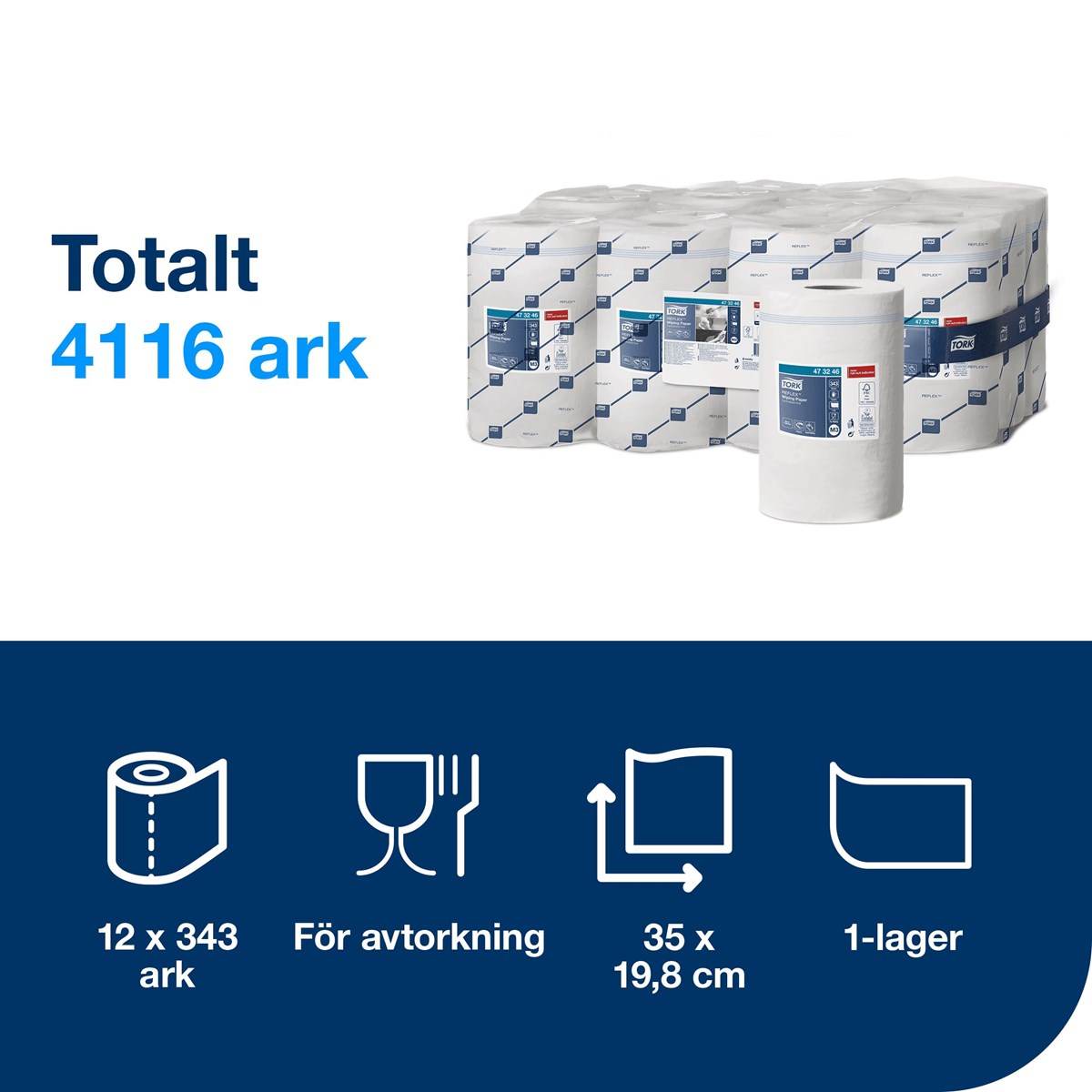Ett 1-lagerspapper vars styrka och höga absorptionsförmåga gör att det passar perfekt för både avtorkning och för att torka händerna. Kan användas i Tork Reflex dispenser Mini centrummatad som matar ut ett ark i taget vilket minskar åtgången och minimerar risken för smittspridning. Våtstarkt, perforerat och centrummatat papper. Godkänt för livsmedelskontakt. 1-lags, 343 ark. 120 m x 19,8 cm. 12 rullar/förp.