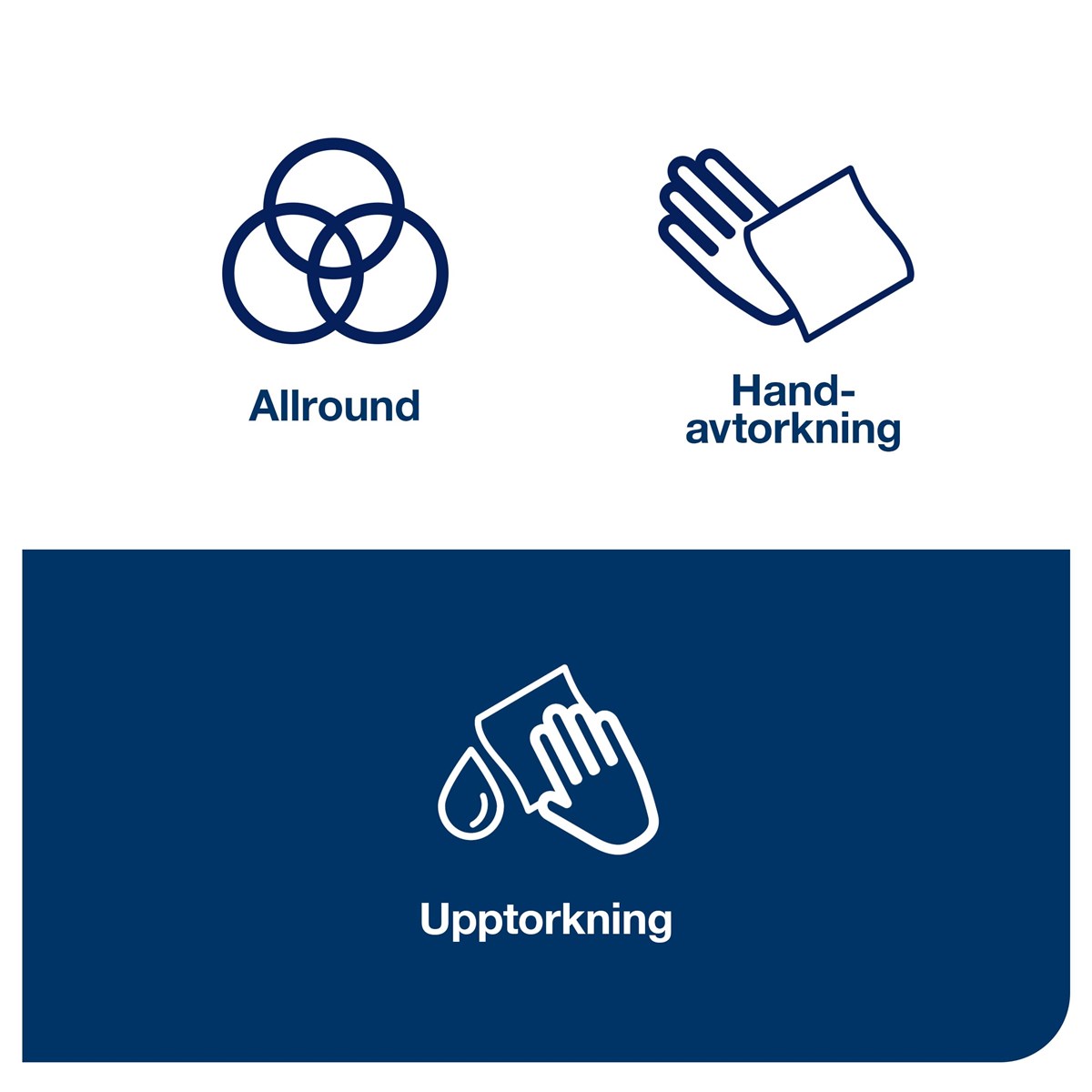 Utmatning av ett ark i taget minskar förbrukningen Mångsidig användning tack vare hög slitstyrka och absorptionsförmåga Godkänd för kontakt med livsmedel Enkel påfyllning med SmartCore avtagbar hylsa Slutindikator