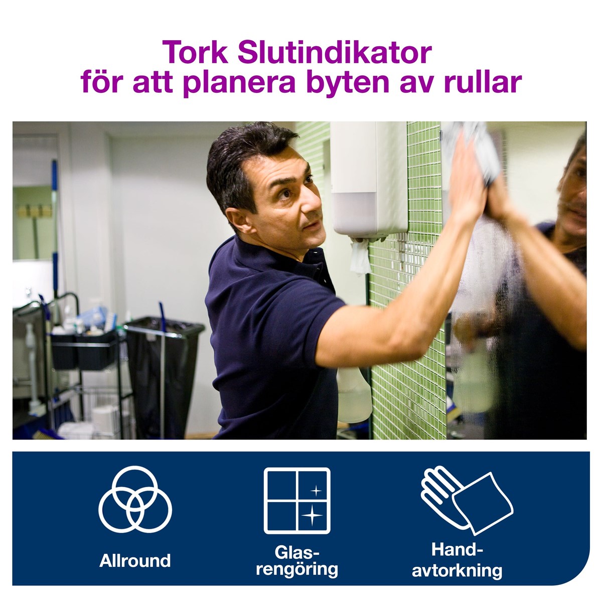 Tork slutindikator hjälper dig att planera dina byten av rullar och undvika avbrott och irritation Idealisk för avtorkning av händer och lätt smutsade ytor Speciellt lämpligt för rengöring av glas – lämnar inte något ludd eller några ränder på ytan Enkel att använda med endast en hand