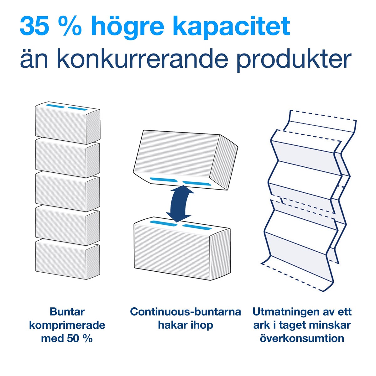 Handdukarna är komprimerade för en ökad kapacitet på 250% För välbesökta toalettutrymmen Smidig utmatning på tre sekunder Matar ut ett ark i taget vilket ger förbättrad hygien och minskad konsumtion