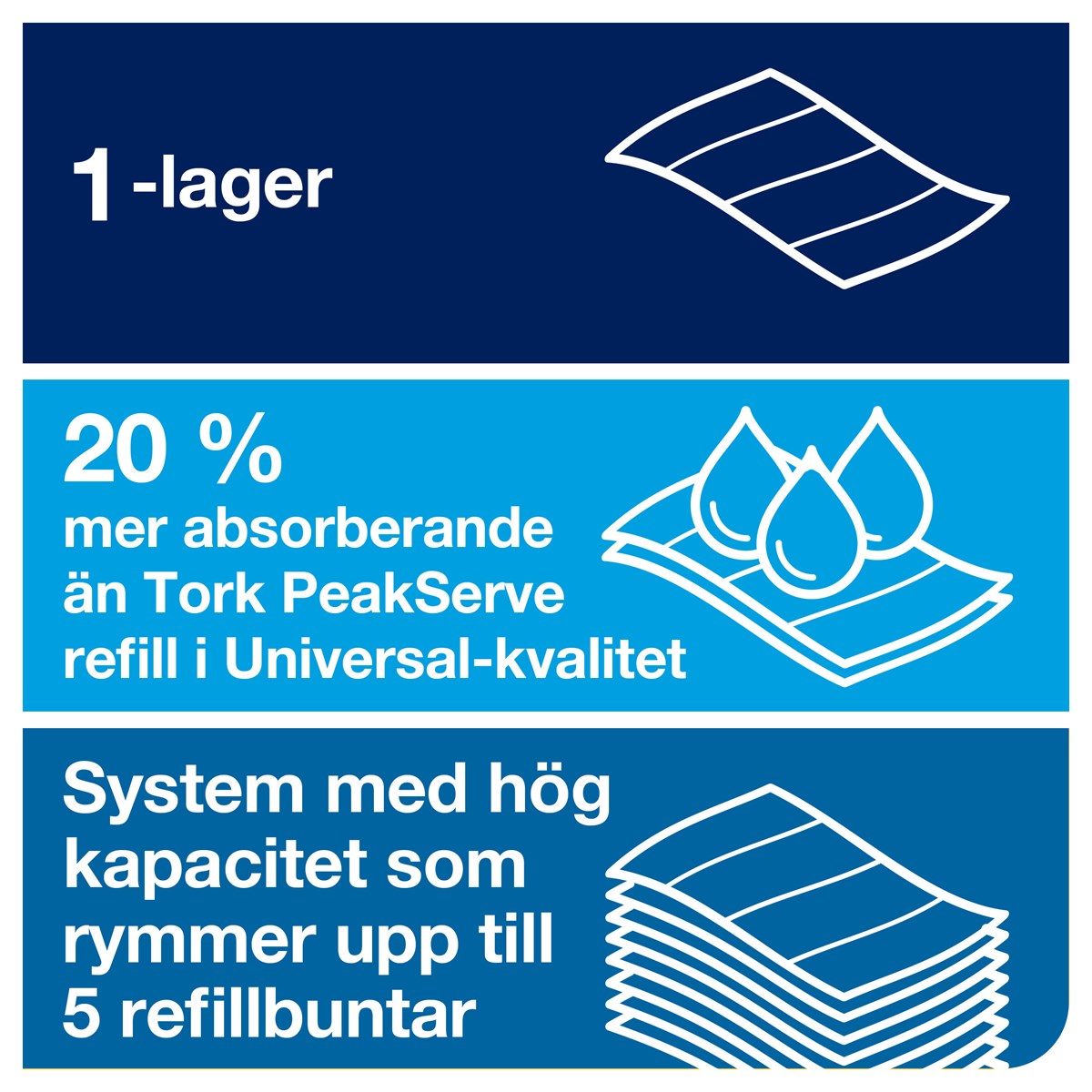 Komprimerade handdukar ger 50 % ökad kapacitet Mjuka och absorberande Idealisk för välbesökta toalettutrymmen Utmatning av en i taget för förbättrad hygien och minskad förbrukning
