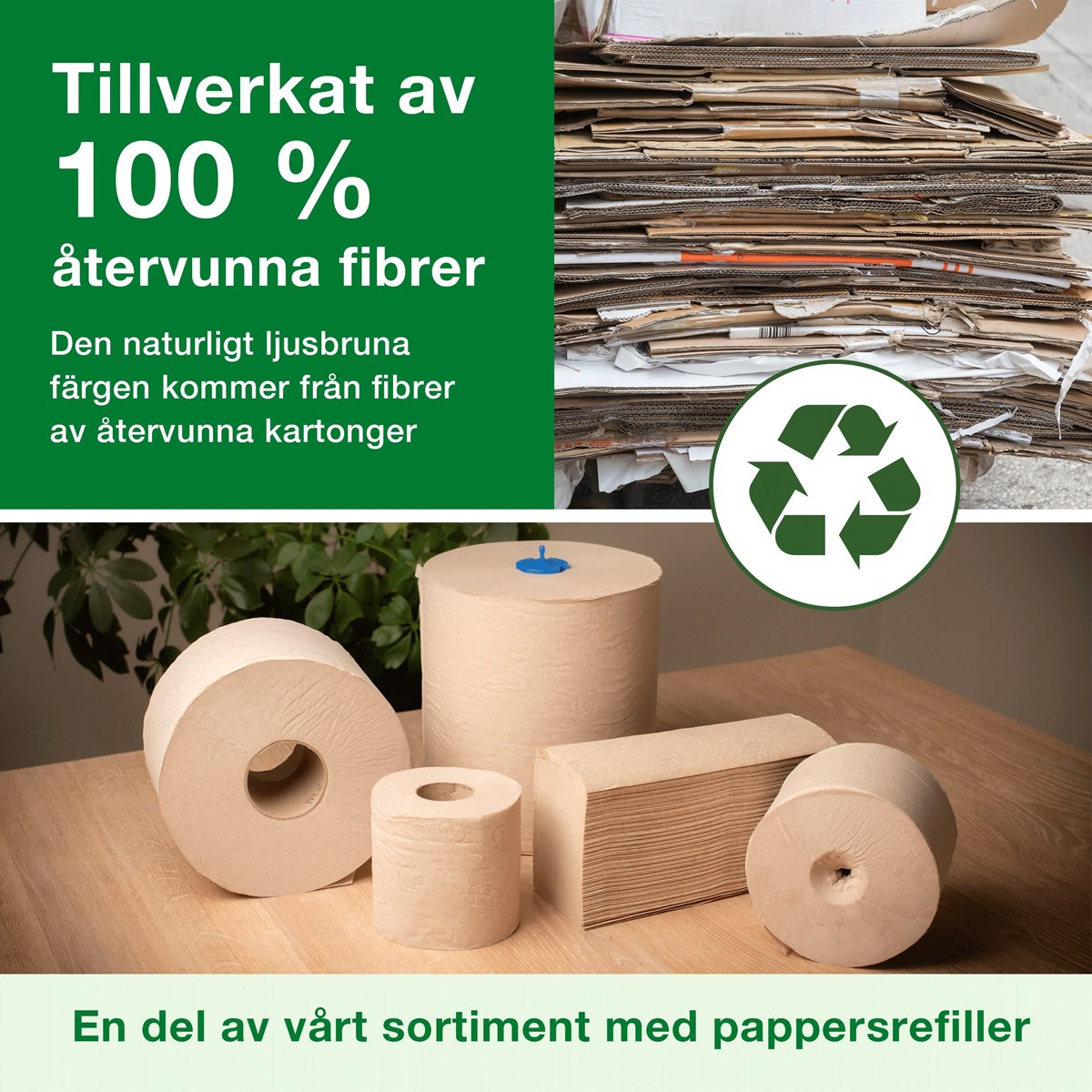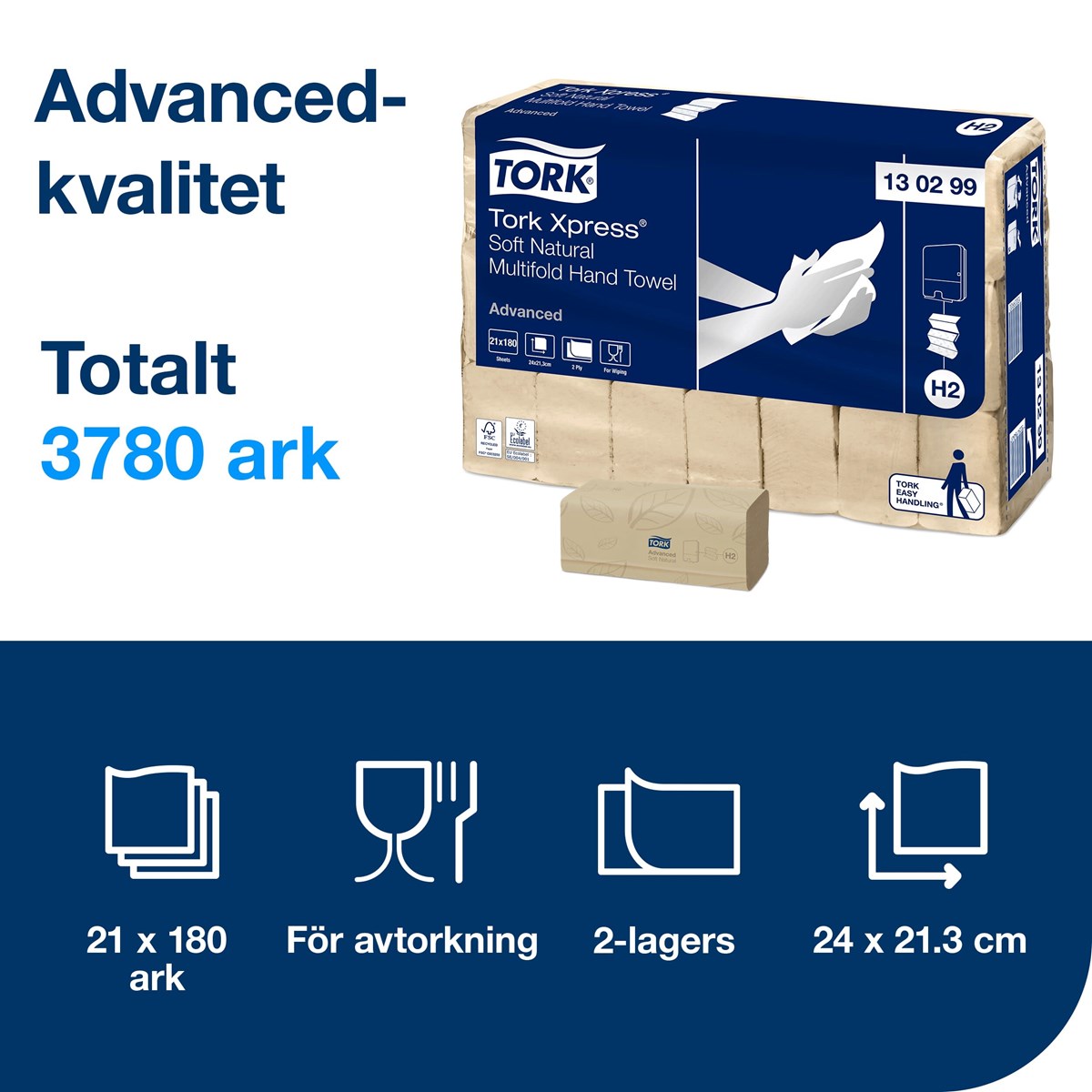 Handdukarna är skonsamma mot huden och förmedlar en känsla av hög kvalitet. Den ljusbruna färgen kommer från fibrer av återvunna kartonger. Inga färgämnen tillsätts vid tillverkningen. Kompatibel med Tork H2-dispensrar. Lämpliga för toalettutrymmen med medelhög besöksfrekvens. Dispensern får plats i små utrymmen och erbjuder dina gäster både komfort och hygien. Pappret tillverkas av 100 % återvunna fibrer. Mått: 24x21,3 cm. 180 st/bunt, 3780 st/förp.