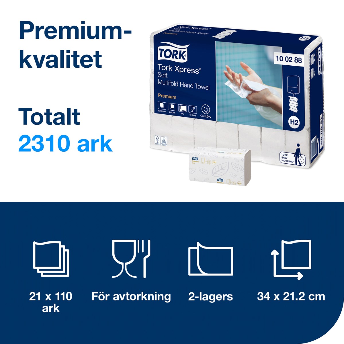 Erbjud utmärkt handavtorkning och gör det bekvämt för dina besökare med den stora och mjuka Tork Xpress® Mjuk Multifold Handduk, som är skonsam mot huden med en känsla av hög kvalitet. Denna handduksmodell passar i Tork Xpress® Dispenser Multifold Handduk för toalettutrymmen med medelhög besöksfrekvens. Tork Xpress® Dispenser Multifold Handduk får plats i små utrymmen och erbjuder dina gäster både komfort och hygien. Mått: 34x21,2 cm.