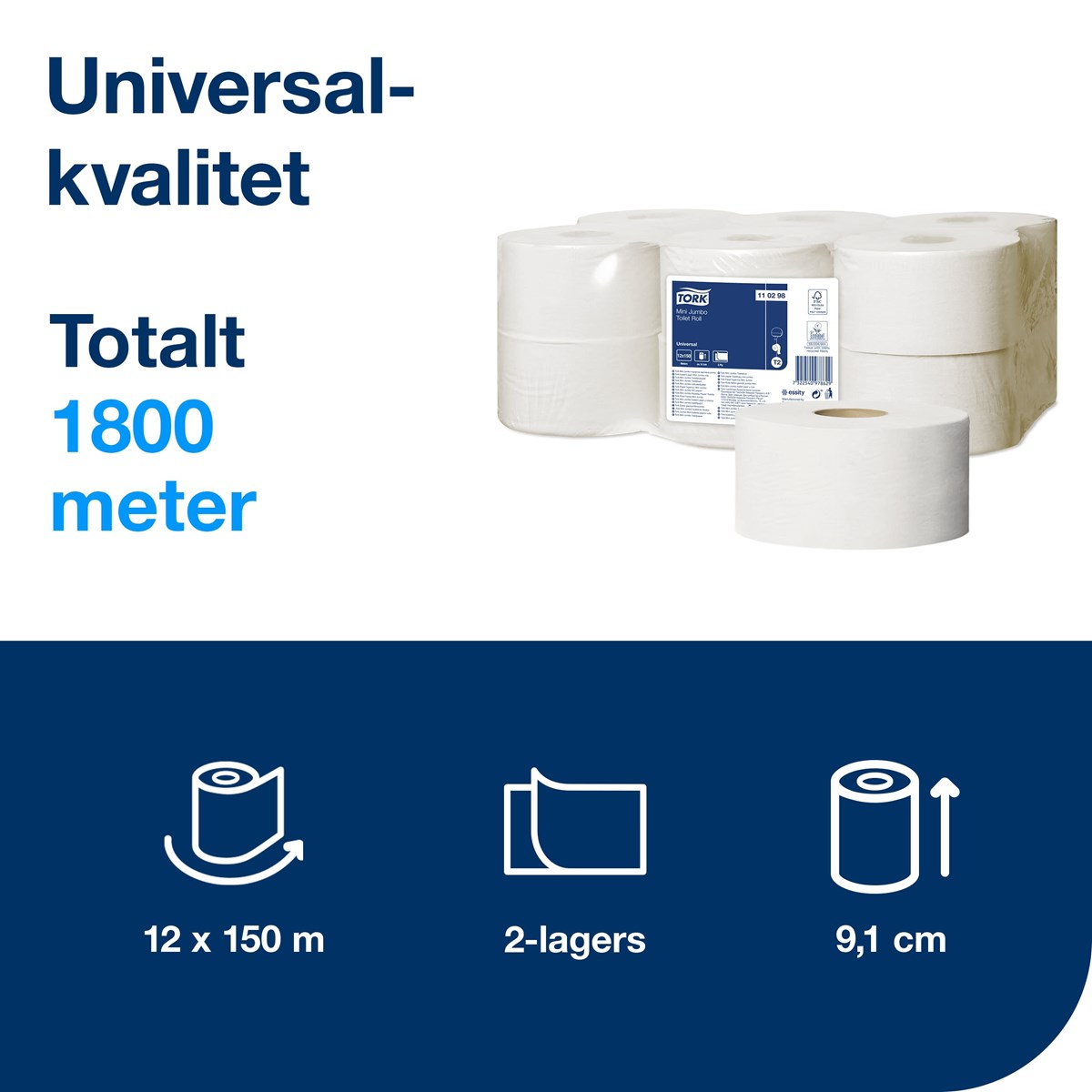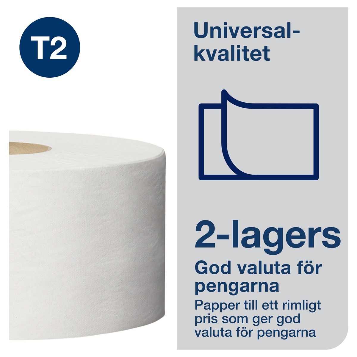 Tork Mini Jumbo-systemet innebär effektivt utnyttjande av tiden och minskade kostnader och erbjuder mycket mer toalettpapper än standardrullar. Tork Universal Mini Jumbo toalettpapper med 2 lager tillgodoser de grundläggande behoven i ett toalettutrymme, erbjuder bra värde för pengarna och är lämpligt för platser med medelhög till hög besöksfrekvens. 150 m/rulle. 12 rl/förp. Passar till Tork hållare T2.