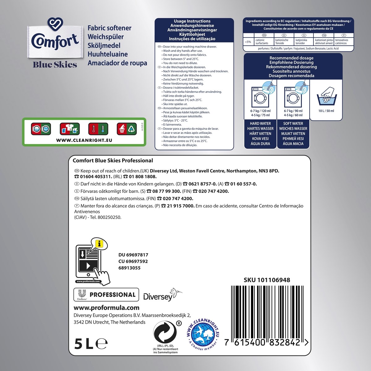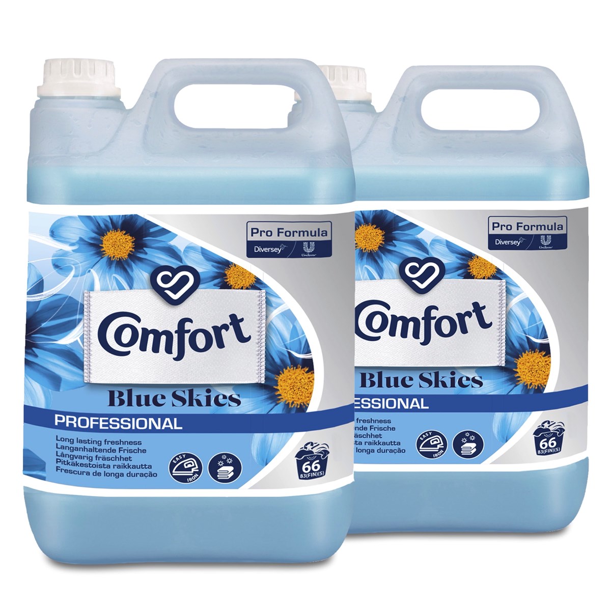 Comfort Professional Blue Skies är ett skölj- och antistatmedel för alla slags textilier. Innehåller parfym. Om du använder den i varje tvätt blir textilierna mjukare och skonsammare mot huden och textilierna kan andas och färgerna skyddas.